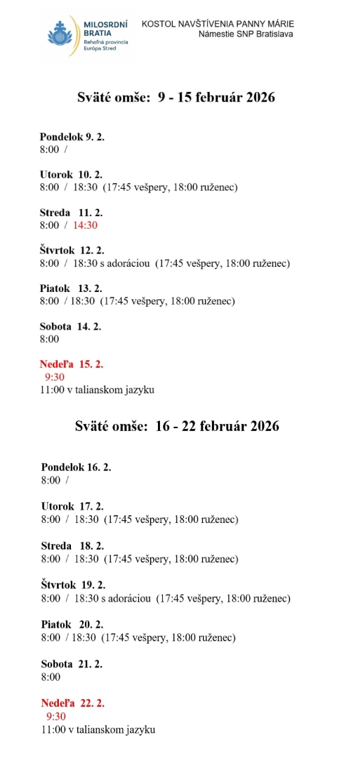 Pravidelné sv. omše v kláštornom kostole OH - Navštívenia Panny Márie - Bratislava, Nám. SNP 9 (!Môžu sa líšiť od aktuálnych týždenných oznamov!)